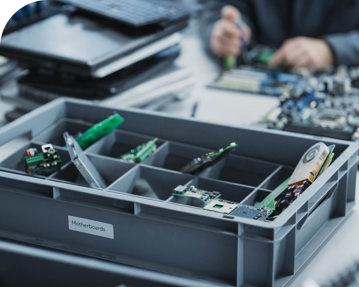 パソコンやプリンタなどの周辺機器、各種電子機器に使用されている基板を回収し、適切な分別・処理を行うことで、金・銀・銅などの有価金属や再資源化可能な素材を回収します。